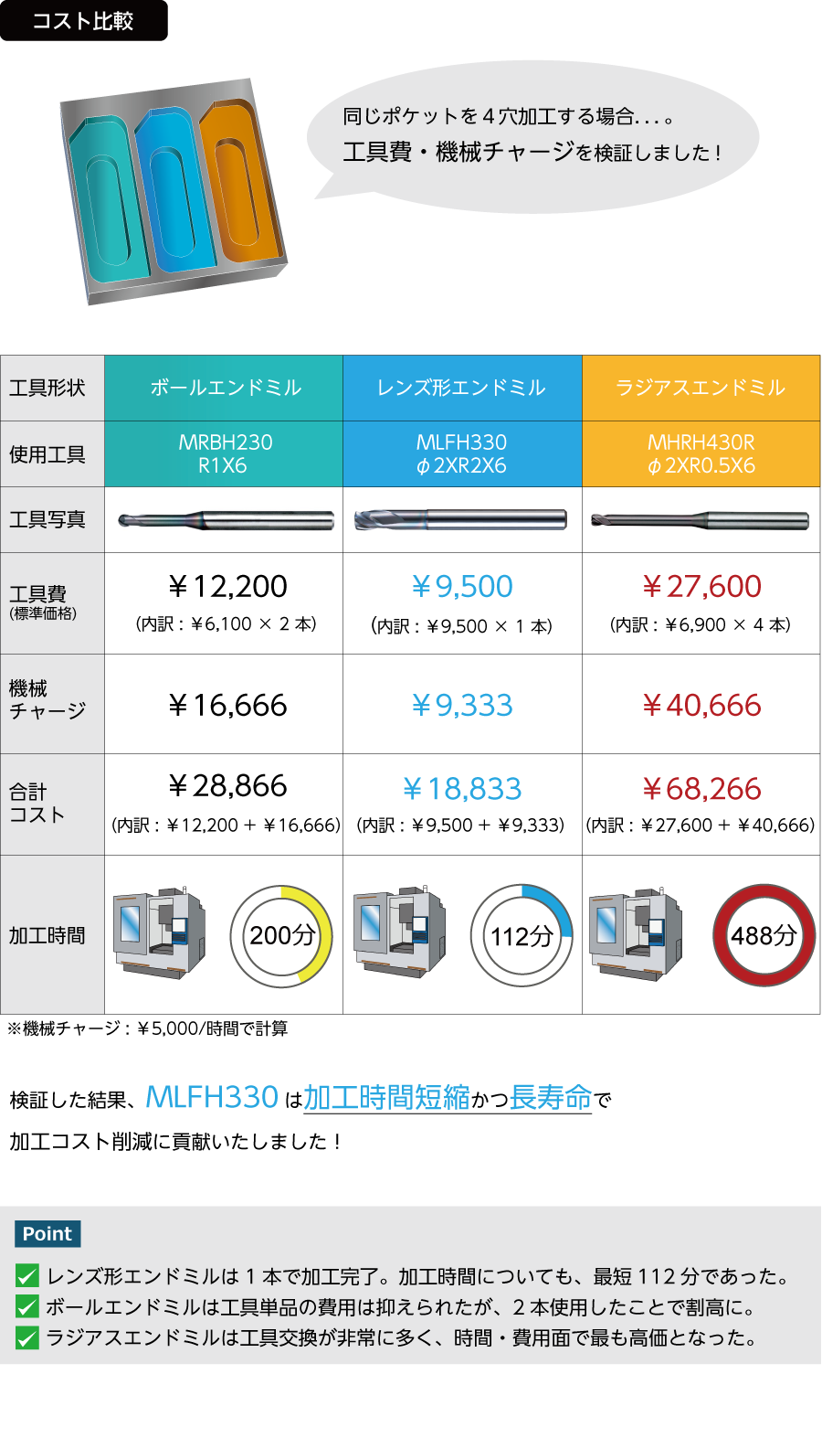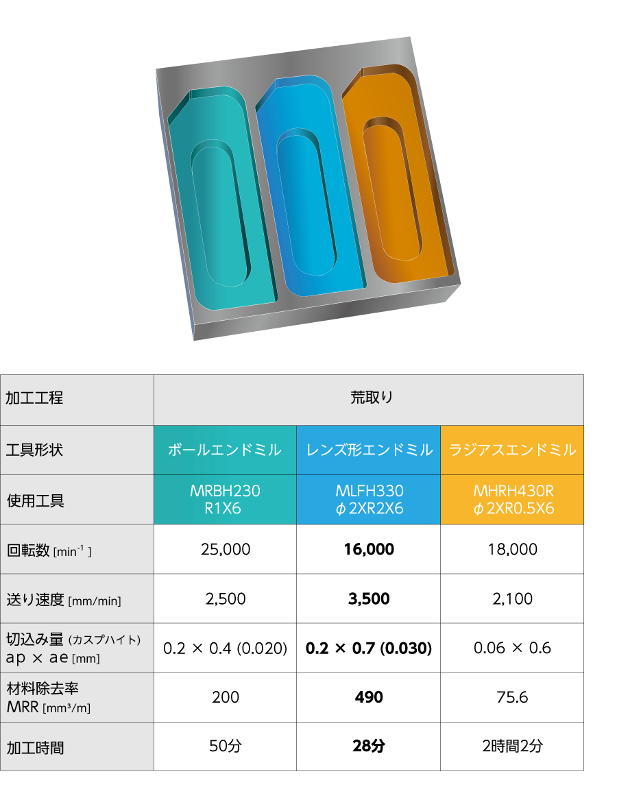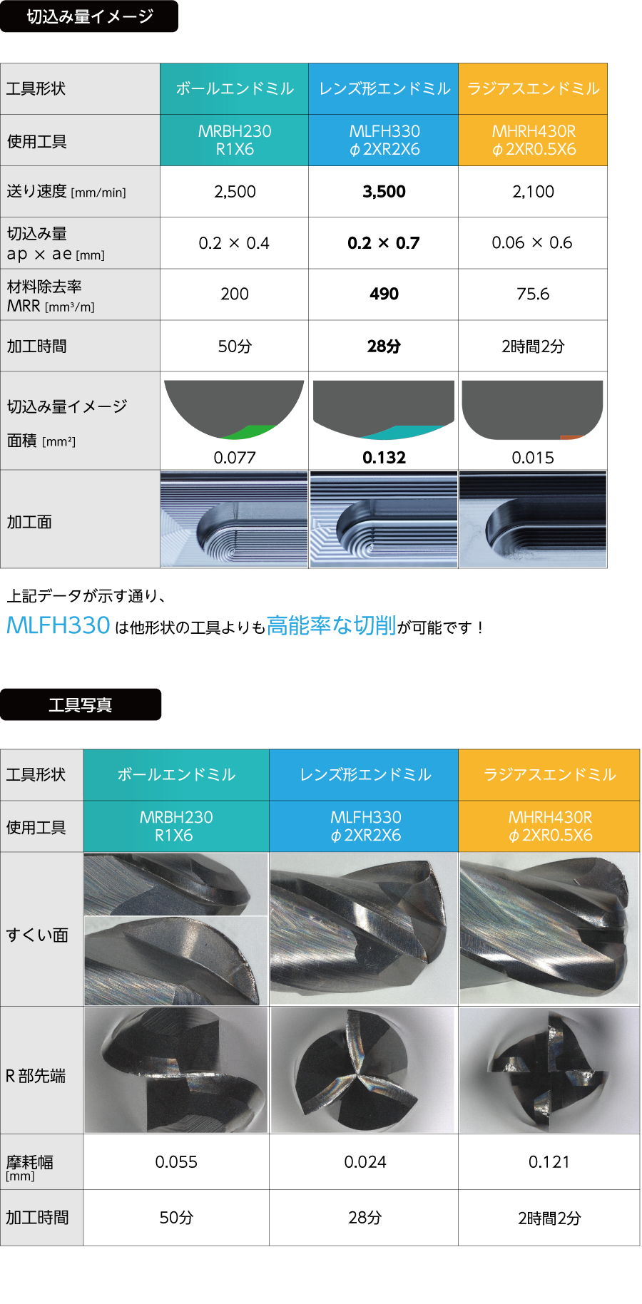 ●3枚刃の採用とボールエンドミルより大きなピックフィードで加工能率が向上!